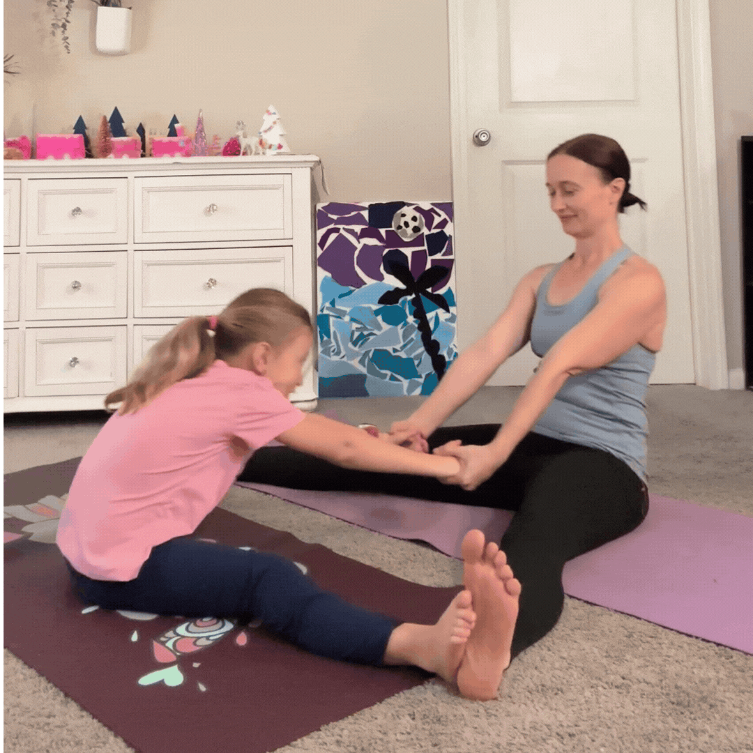 Another great option is sit in a straddle position, toe to toe with your child. There are lots of options here. Side bend. Forward fold. Twist.
