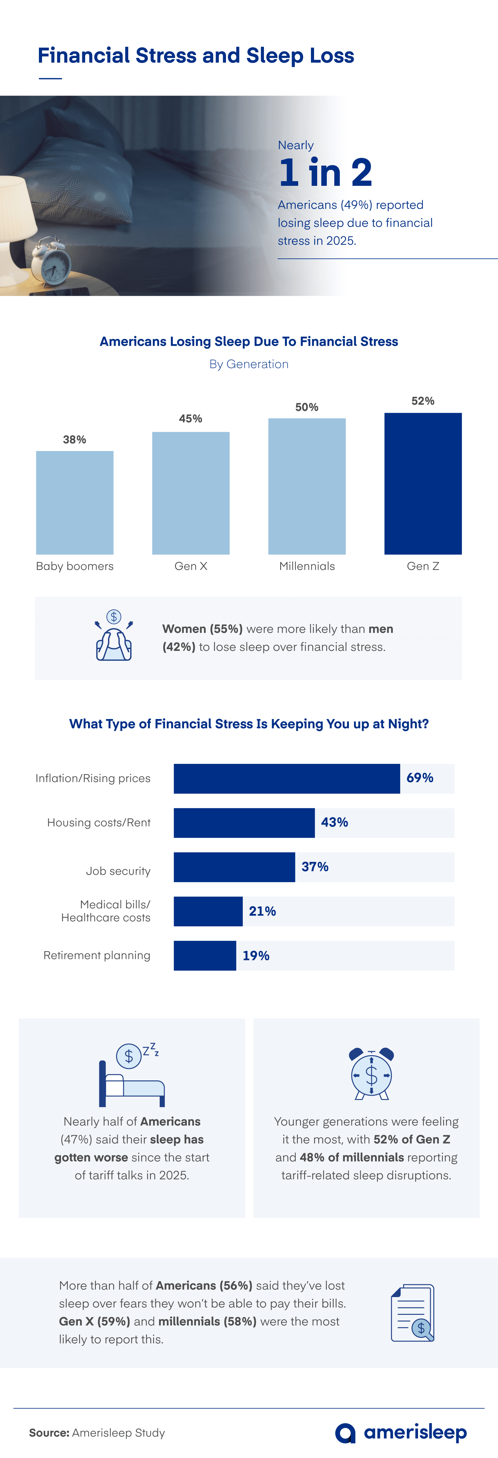 Nearly half of Americans (49%) said they lie awake at night due to financial concerns like inflation and layoffs. Almost as many (47%) said their sleep has worsened specifically since tariff discussions began in 2025.