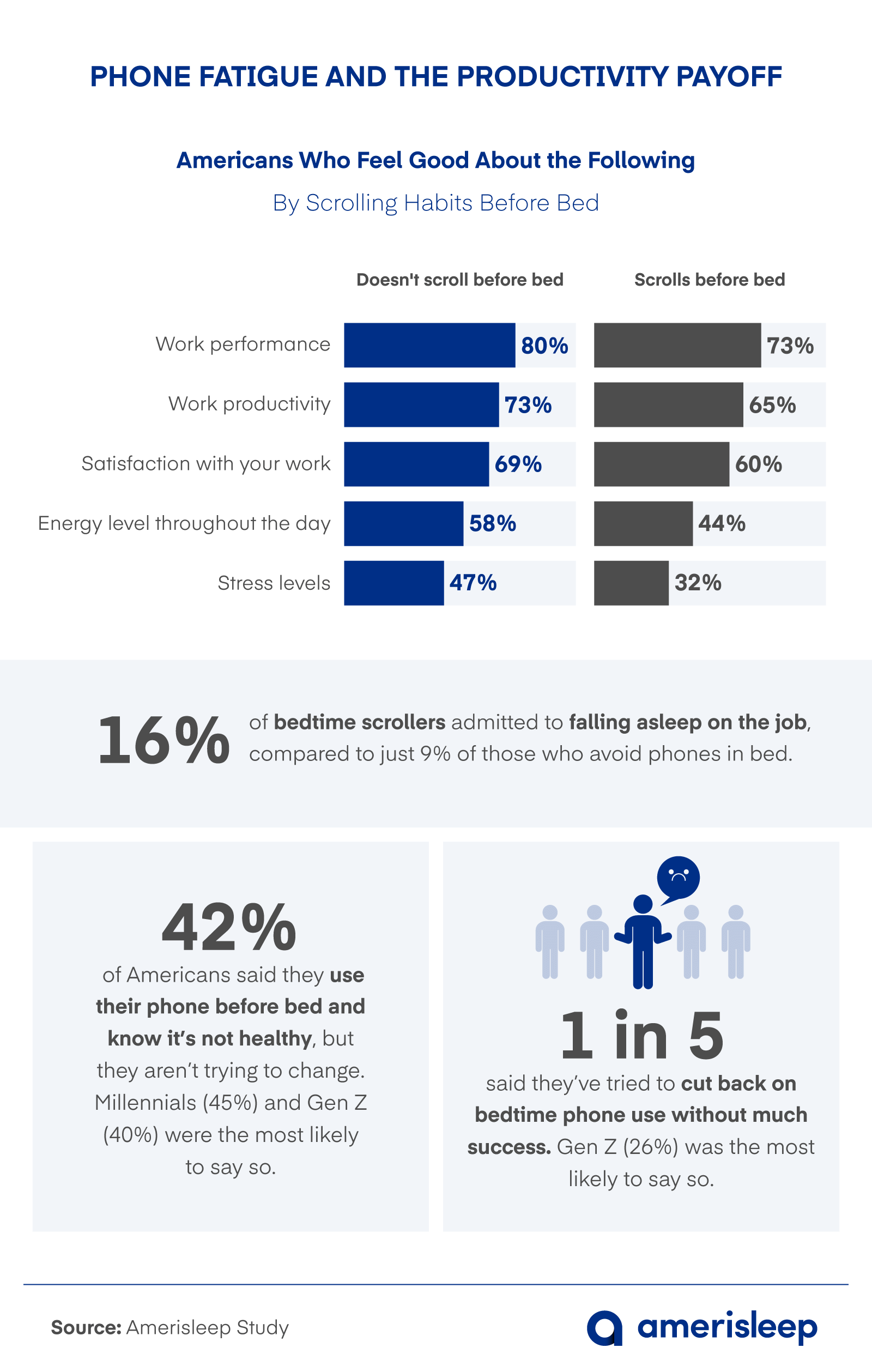 - 1 in 6 bedtime scrollers admit to falling asleep on the job, and 1 in 4 have missed a meeting, deadline, or shift.
