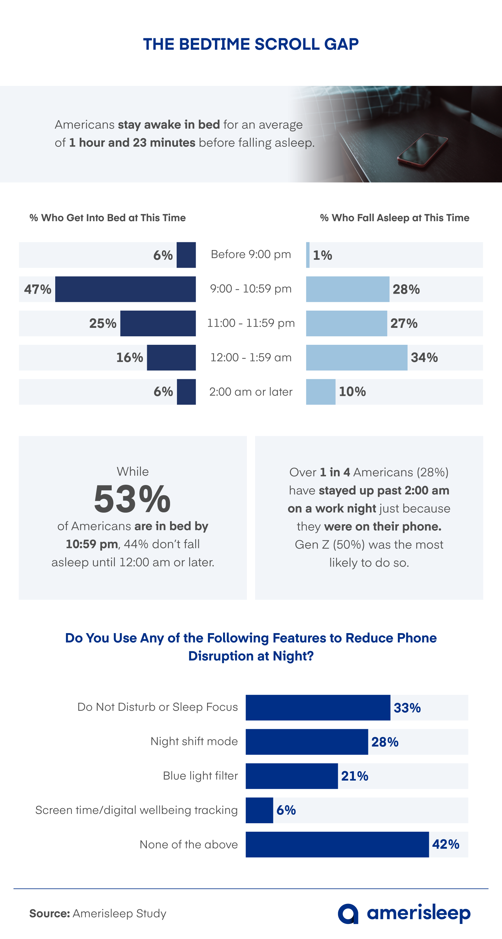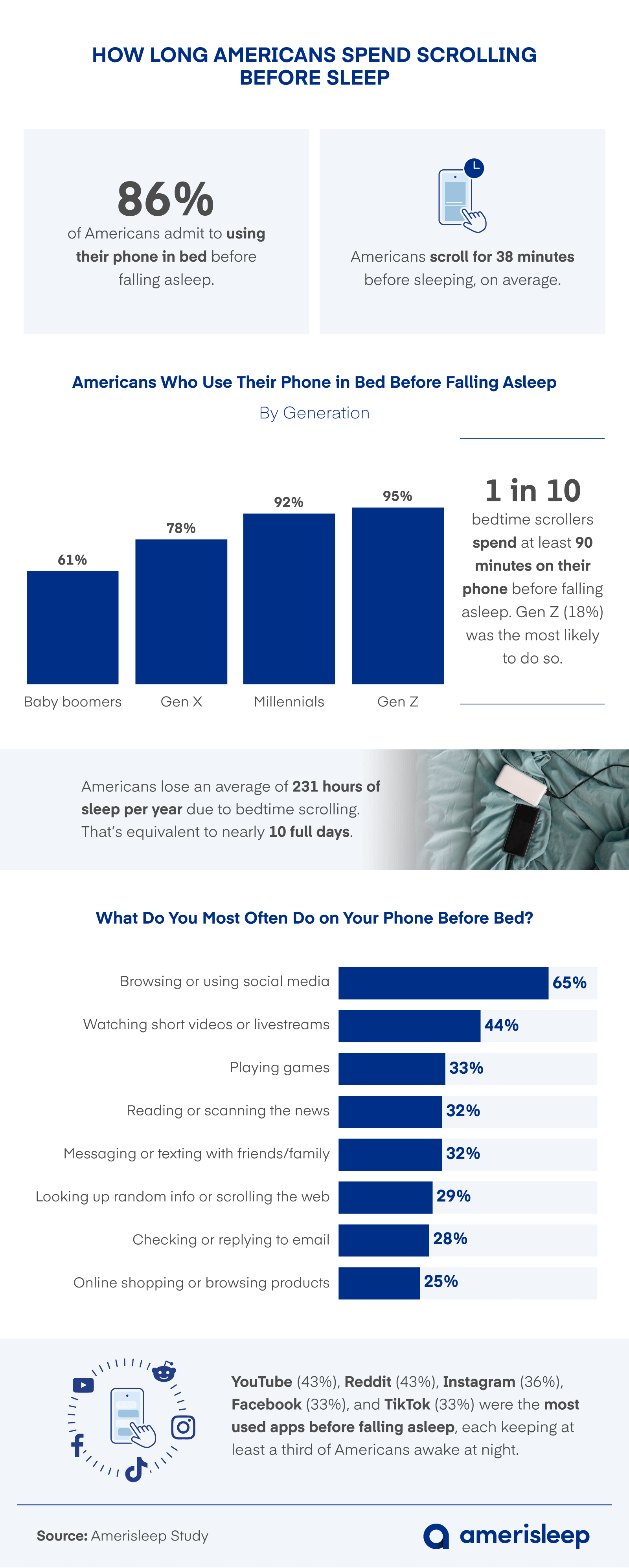 - Americans lose an average of 231 hours of sleep per year due to bedtime scrolling—nearly 10 full days!
