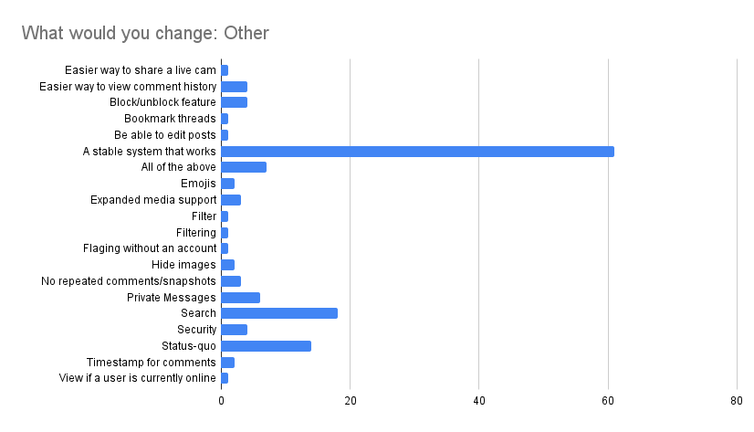 This was one of the more insightful questions in the survey! Like the previous questions, I sorted the “other” responses into themes. There were quite a few pointing out specific bugs in the Disqus. I sorted the bug complaints into the label, “a stable system that works.”