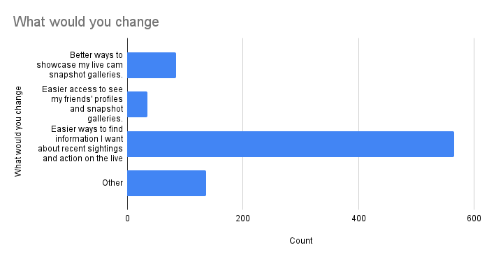 This feature was suggested as a way to use the snapshot galleries in a new fun way. 37.5% of the respondents were uninterested while 40% of the respondents were interested. Several people mentioned in the free-answer portion of this survey that this would be a great way to discuss bear IDs. It’s a fantastic observation that we didn’t consider!