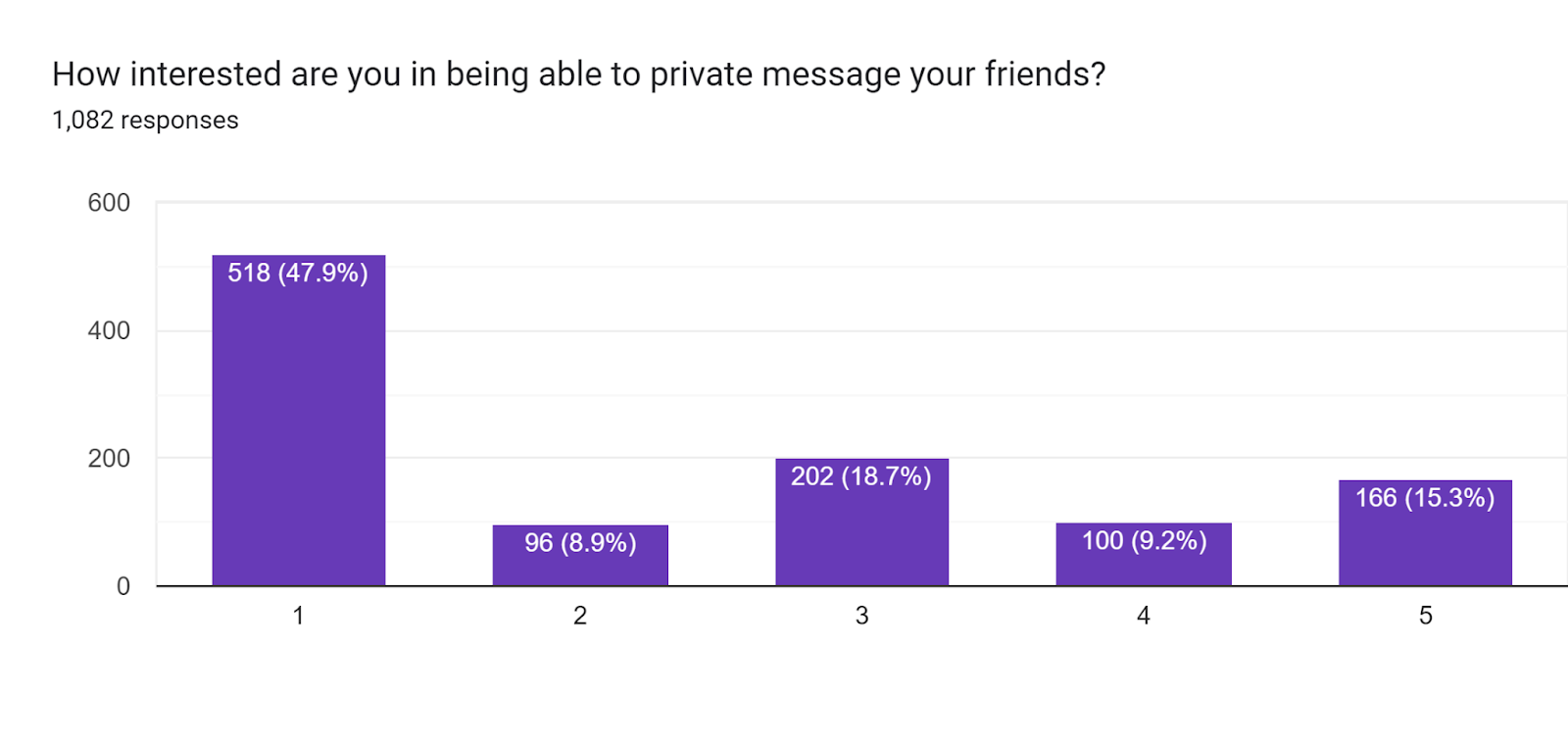 This response was actually somewhat surprising to us! We thought that the ability to private message friends would be a good way to allow for off-topic chatter without making it visible for those that were uninterested, but 56.8% of people were either very uninterested or uninterested in this feature. Only 24.5% of people were interested or very interested in the feature. This was very helpful feedback. Private messaging adds a layer of complexity to the development process. With such a strong response against private messages it is unlikely we will release this feature in the first phase of the new comment system. There were many responses in the free answer portion that specifically asked for private messages. If you were one of those people, know that this doesn’t mean we won’t ever support private messages. It just means that it will not be prioritized over some of the other highly requested features like expanded search and comment filtering.