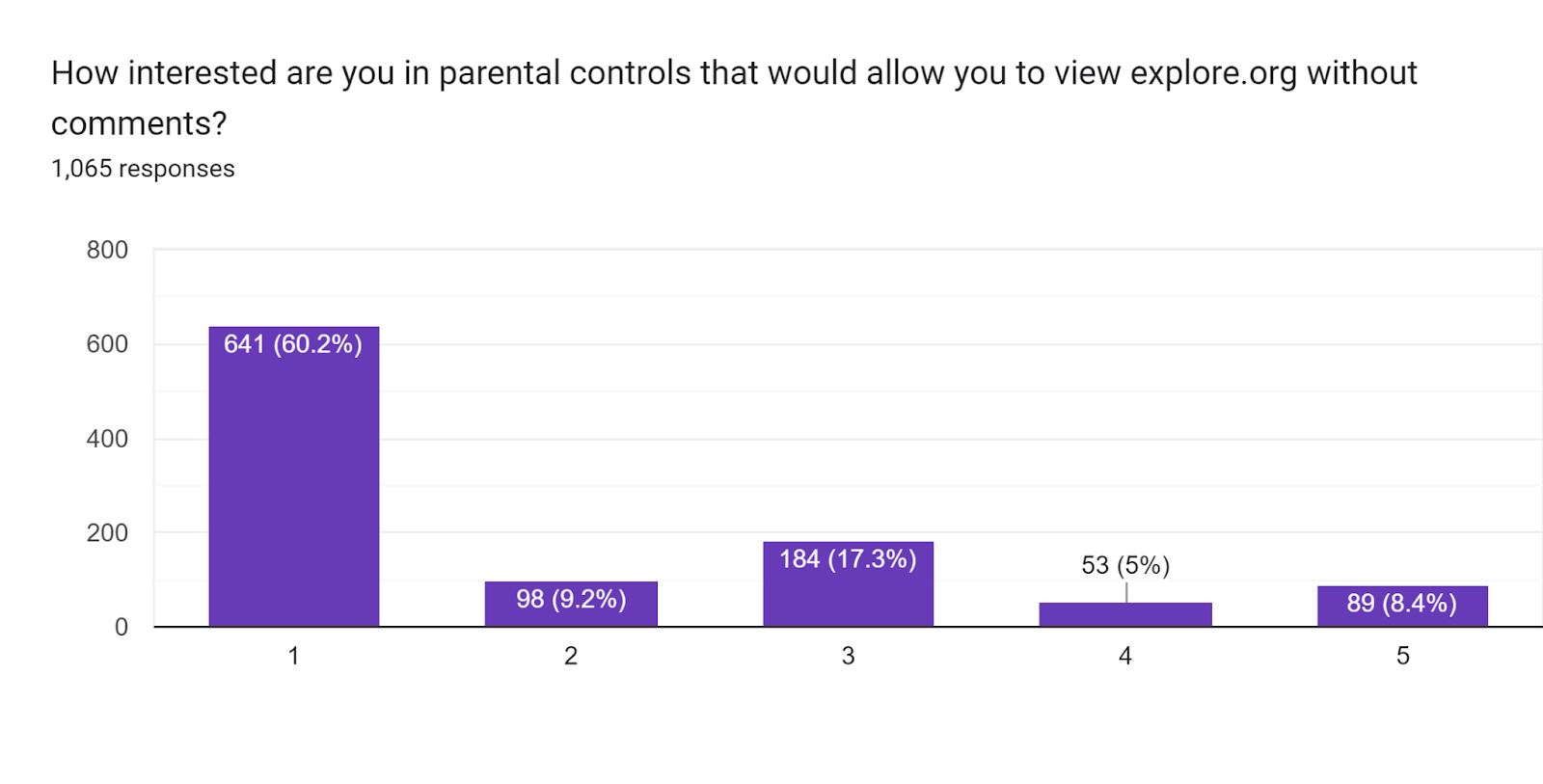 We suggested this feature because we know that many schools and parents have their kids watch explore. It is not a huge surprise that 69.4% respondents were not interested in this feature while only 13.4% were interested. Explore’s website audience does trend to people who no longer have school age children. This strong response against parental controls means that it will not be very high on the feature list. Again, this does not mean that we will never release this feature, only that it will not be prioritized in the beginning.