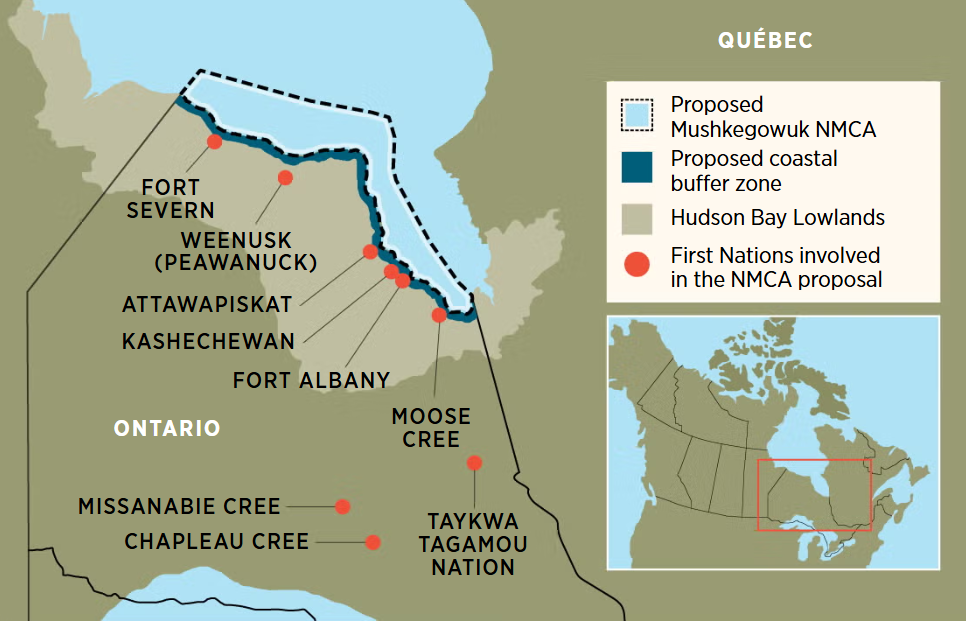 Map: Emily Renaud/Audubon. Data: First Nations, Hudson Bay Lowlands, Open Government License, Canada (2024); Proposed NMCA and Coastal Buffer Zone; Mushkegowuk Council (2024).
