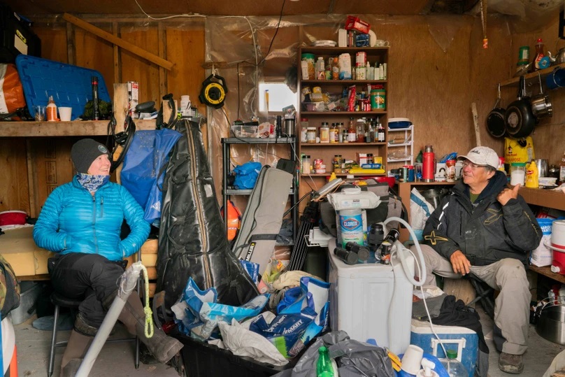 Carrie Gray (left) talks with Sam Hunter in his cabin, which is filled with gear and food. Photo: Sydney Walsh/Audubon