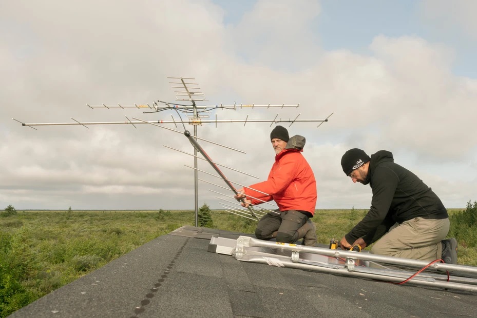 Together, they hit upon a solution: Secure the 10-foot pole to the side of the building with what Mack christens “Cree clamps”—durable snowmobile belts drilled into the framing. The antenna will stick only a few feet up above the roof, and Hunter will affix the solar panels to the side of a new cabin addition he plans to build before the snow comes in. Standing on the roof, Hesselink appraises the setup. “It makes it look like the highest-tech shed,” he jokes.