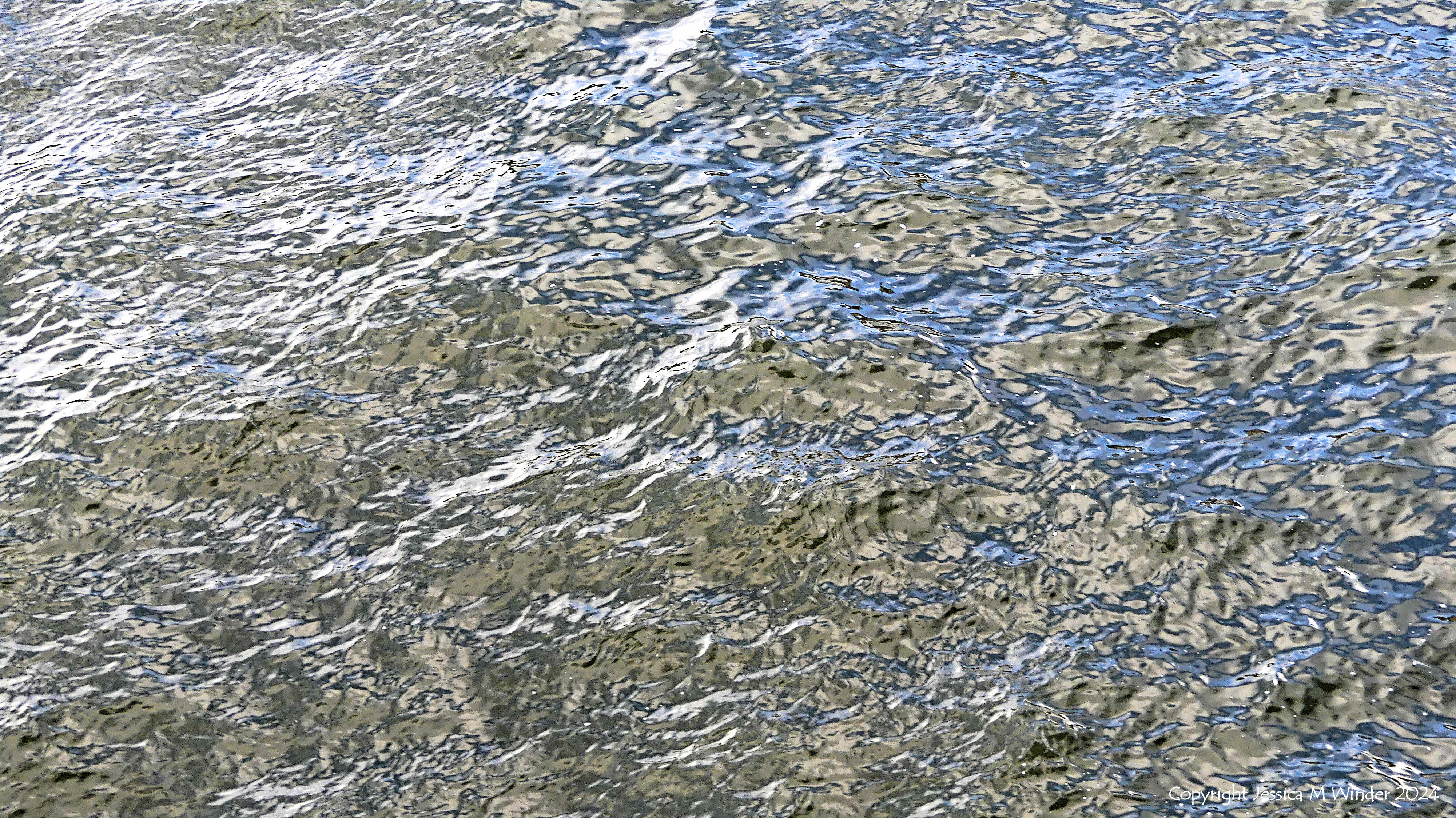 Natural patterns of flow and reflection on the River Thames, December 2024, photographed from Golden Jubilee Bridge between Waterloo and Charing Cross Stations in London.