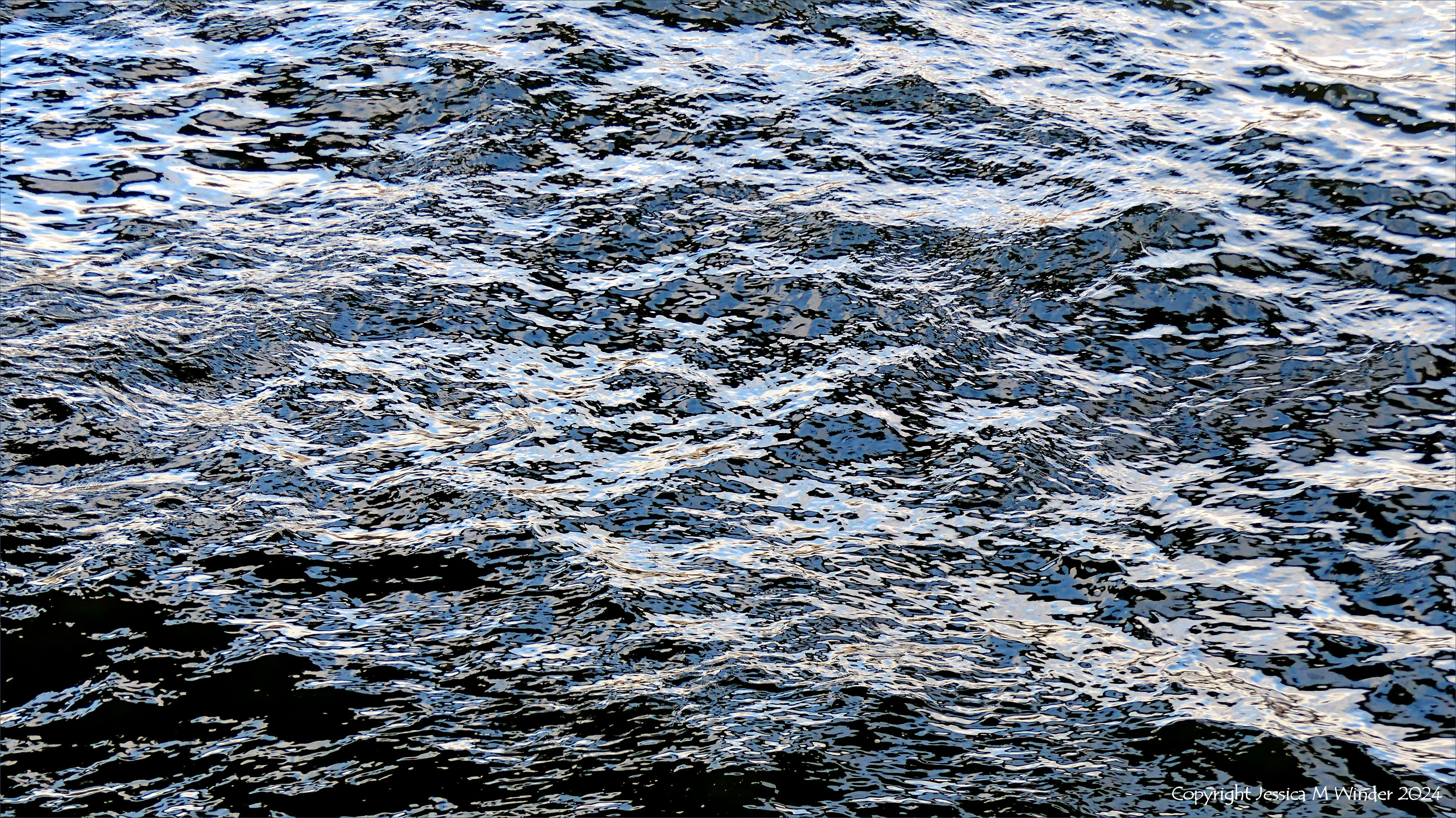 Natural patterns of flow and reflection on the River Thames, December 2024, photographed from Golden Jubilee Bridge between Waterloo and Charing Cross Stations in London.