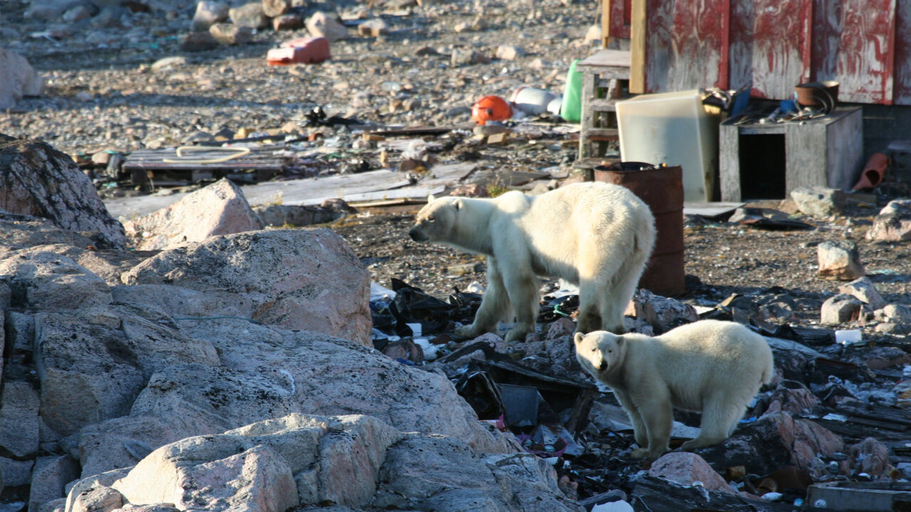 Polar bear mother and cub scavenging, Cape Tobin, Ittoqqortoormiit, Greenland