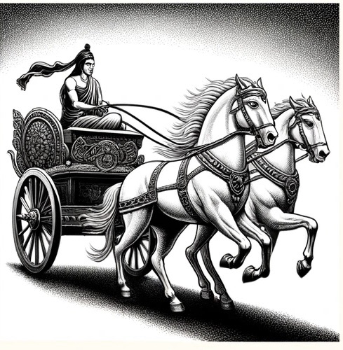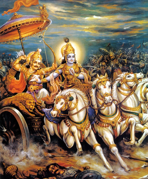 In a chariot race as enthralling as that in the film Ben Hur, Arjuna and Duryodhana raced to Krishna to ask for his assistance. Krishna, said to be a representative of the Divine, gave them both a choice. One could have him as his charioteer with the proviso that he would not take part in the battle, and the other could have all of his armies.