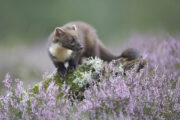 - Pine marten (Martes martes) in flowering heather, Scotland.