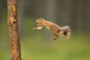 - Red Squirrel (Sciurus vulgaris) in mid-air, about to land on pine trunk.