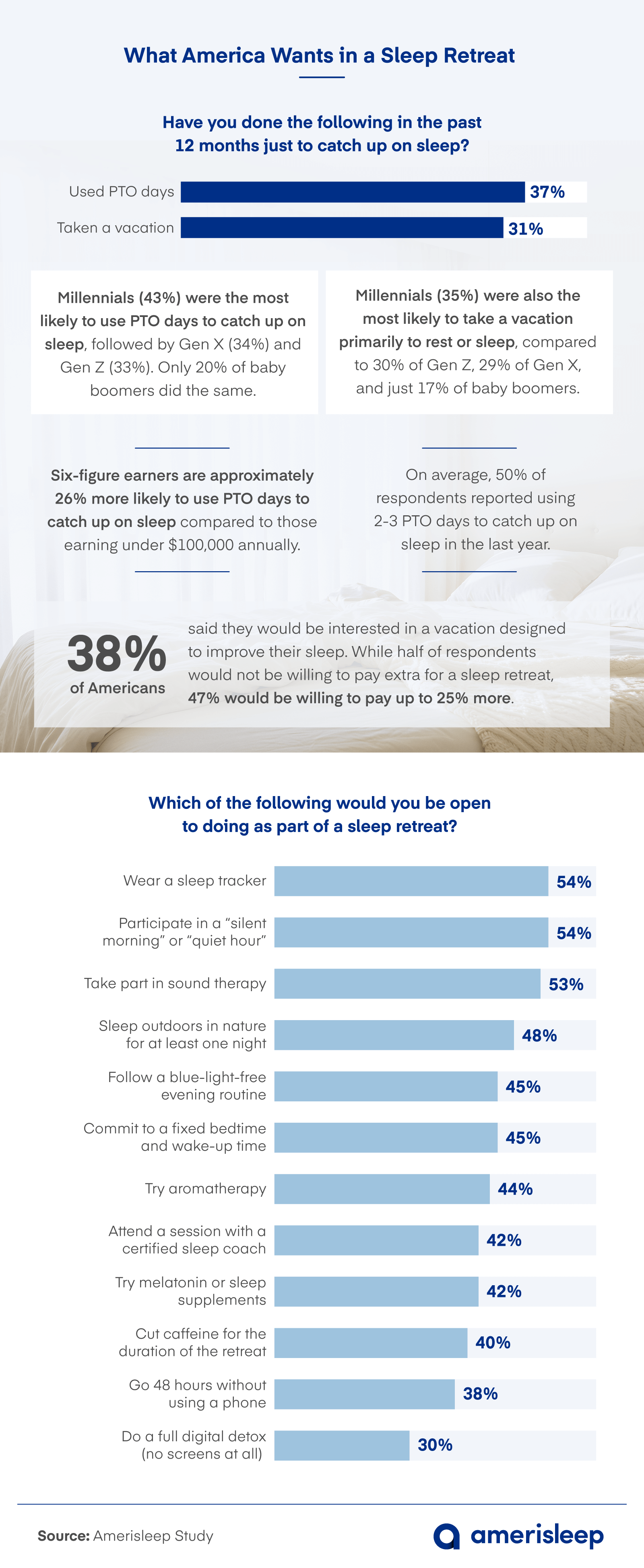According to our survey, taking time off to catch up on sleep has become a necessity for many Americans. Here’s who’s doing it the most and what they’d want in a sleep retreat.