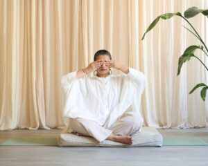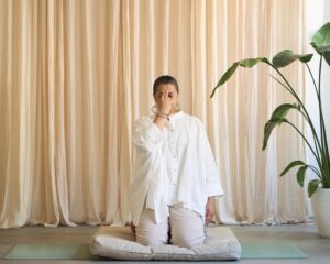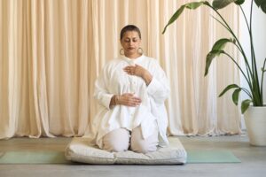 Sitting in hero’s pose on floor with one hand on belly and the other on heart