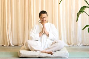 The cross-legged position naturally encourages an upright spine when done properly. This vertical alignment opens the chest cavity and prevents the collapse that occurs when slouching, giving the lungs more space to expand fully. The prayer hand position further reinforces this by drawing the shoulders back and opening the chest.