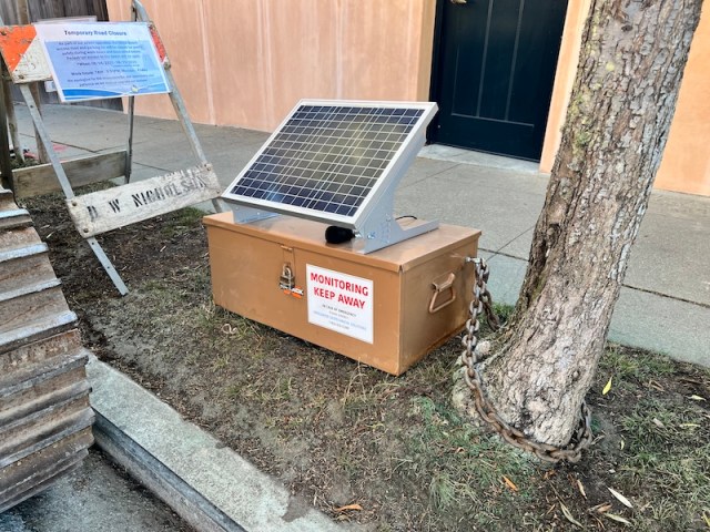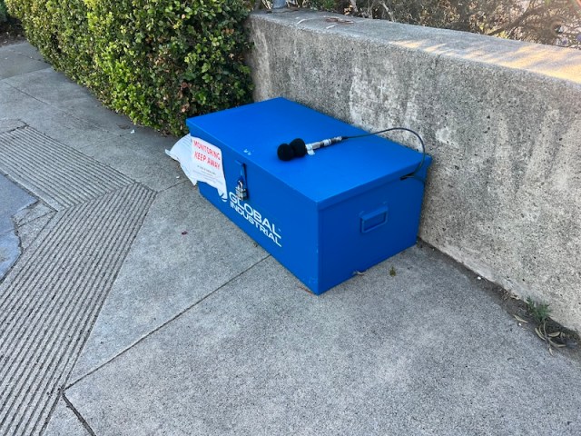 I went for a walk at the end of the day, down to the Bay at China Beach, here in San Francisco, and I encountered two microphone installations toward the end of the road. There’s a lot of construction going on, both domestic and municipal, and these boxes appear to be either seismic or noise monitoring setups. Maybe both. The company employed to do the monitoring is Integrated Geotechnical Solutions, Inc. (more at igs-inc.com). I stood at both sites, contemplating aloud what they might be, fully aware I was doing so with microphones in plain sight, but also wondering if the mics were even concerned with signals audible to human ears. One of the boxes employs solar power. The power source of the other was unclear. I have a tiny little noise monitor, called the AudioMoth, and these seem to be sort of like large, industrial versions of that. I hope to learn more.