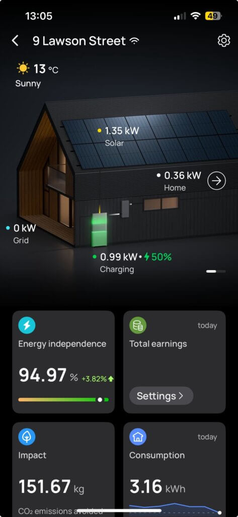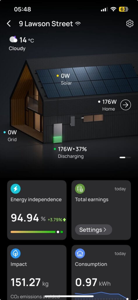 The panels weren’t producing any power (it was still almost dark!) but we weren’t using any from the grid either. Since 7pm the evening before, when solar generation ceased, with a low sun in a cloudy sky, the house ran on solar electricity generated the previous day and stored in and then released from the battery which was still 37% full (that’s 63% empty for pessimists). A dribble of solar started again around 7am which slowed the rate of battery depletion which bottomed out at 20% around 8:30am and then battery began to fill again as solar generation exceeded our power use, even though it was a cloudy, slightly drizzly, morning.