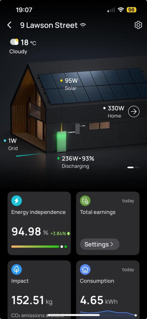 By 7pm the battery has reached 100% (at c5pm) and the solar generation is dropping and so it’s a mixture of solar and discharging the supply from the battery which is powering the house: