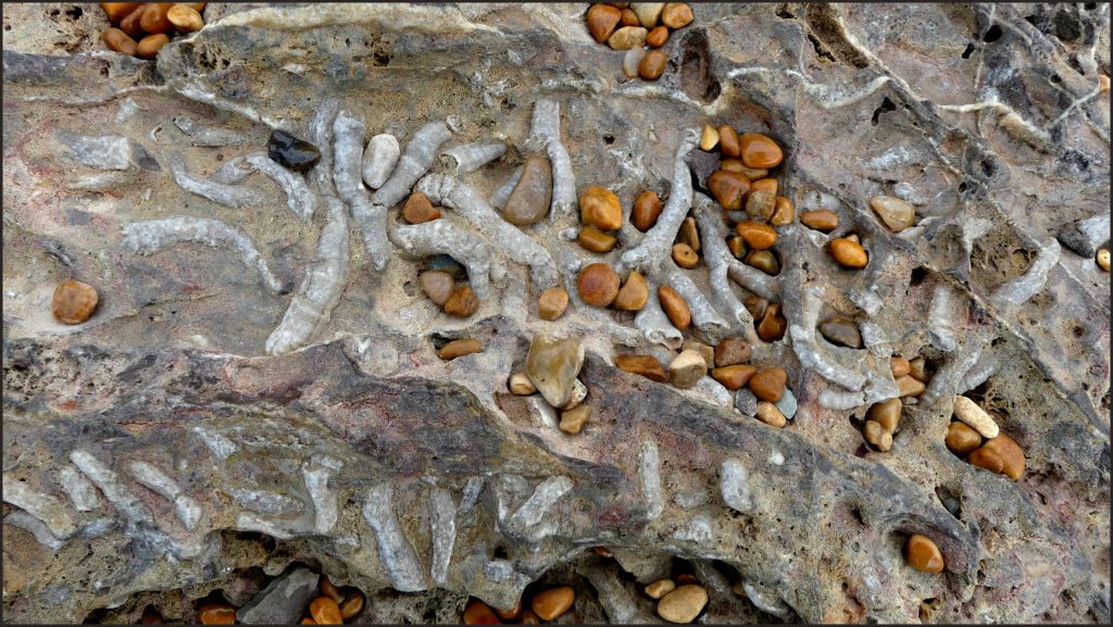 This image is a detail of the natural abstract pattern and texture on one such rip-rap boulder at Seatown in Dorset. It shows fossilised burrows, made by crabs in the soft seashore sediment of the prevailing environment many millions of years ago, now revealed in the weathered surface of the boulder.