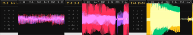 ▰ I got a pickup that separates a guitar into six (fairly) distinct outputs. It’s neat seeing, thanks to an oscilloscope, how the notes ring out in a chord. This is three pairs of strings, from lowest (left) to highest (right).