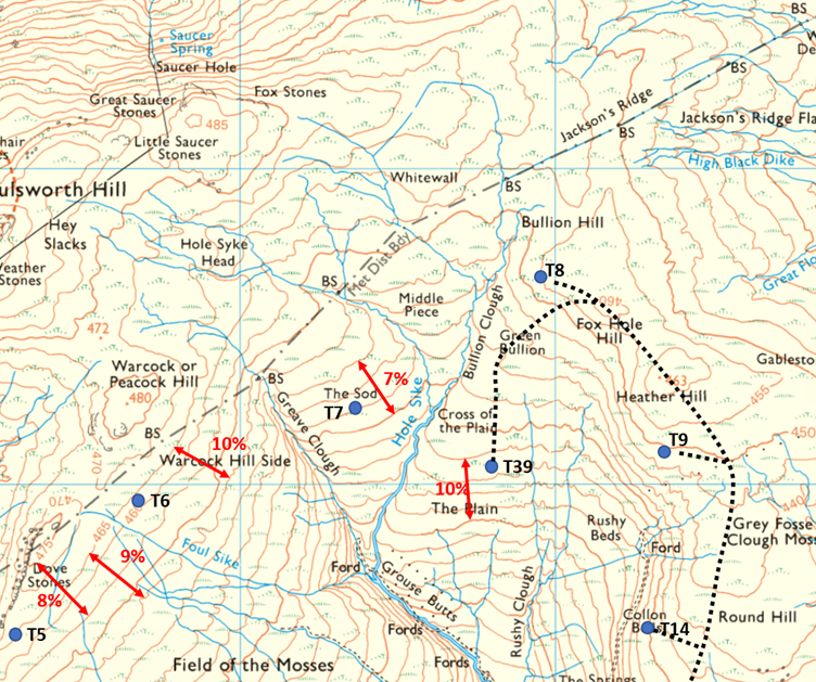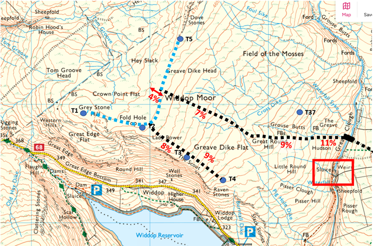 Heather Hill down to the reservoirs via T8-T9-T14 is bog standard aggregate track terrain. Project Director Christian Egal can drive his 2CV from T8 to John Getty’s house in Walshaw Dean if Tony Juniper will let him. T7 The Sod is isolated. T37 is doomed like T38/T42.