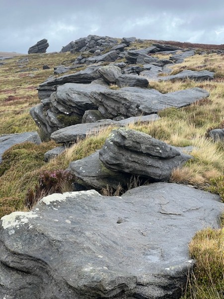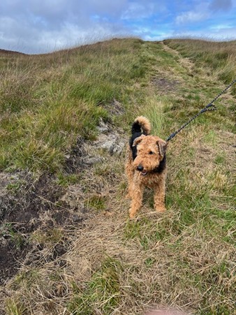 We head for the north boundary of Calderdale Energy Park (CEP), to pin down the last possibilities for lateral movement across the slope west of Greave Clough. Wind farm access roads don’t like traversing. Sideways tip is called crossfall and 5% is a lot on peat. If you can’t walk briskly over the ground, then the 80-metre turbine blade is not coming that way if there is an alternative. You will see from the map that some of our walk was on easy terrier, but the seven miles took us six hours and the Airedale terrier crashed out when he got home. Alert to anything alien, he barked at a boundary stone on the watershed, like the ape at the monolith in 2001. Our question: “Can a turbine blade be delivered parallel to this ancient boundary?”