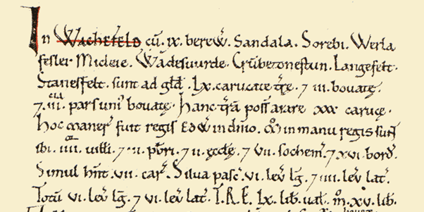 In Wachefeld with ix berewicks: Sandala, Sorebi (Sowerby), Werla (Warley), Feslei, Miclei (Midgley) Wadesuurde (Wadsworth) Crubetonestun, Langfelt & Stansfelt are lx carucates (& iii bovates & the third part of a bovate (ploughable area) xxx carucates (plough teams) (may till these lands) Hoc maner (this manor) was King Edward’s regit Edward’s. (There are now in the) manu regis (King’s hand) iiii villanes & iii priests & ii churches & vii sokemen & xvi bordars. They together have vii plough teams. Silva pase (wood pasture) vi leagues lg (long) and iiii leagues lat (broad). Totu (total) vi leagues lg & vi leagues lat. T.R.E. (in the time of King Edward; Harold was a usurper) (it was worth) lx lib (60 pounds per year), (now) xv lib.