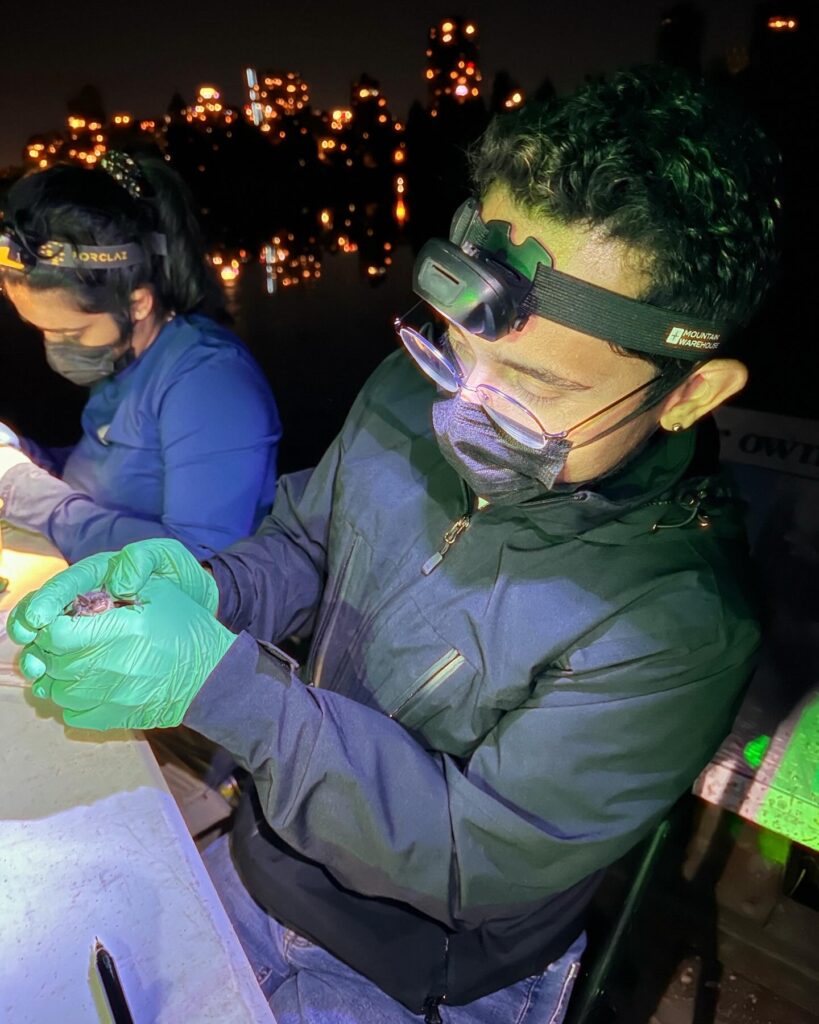 Brandon Weigand assisting the Wildlife Society of Canada’s efforts to monitor threatened bat species in Vancouver. He is holding a Yuma myotis, a common species found throughout the city.