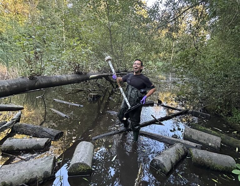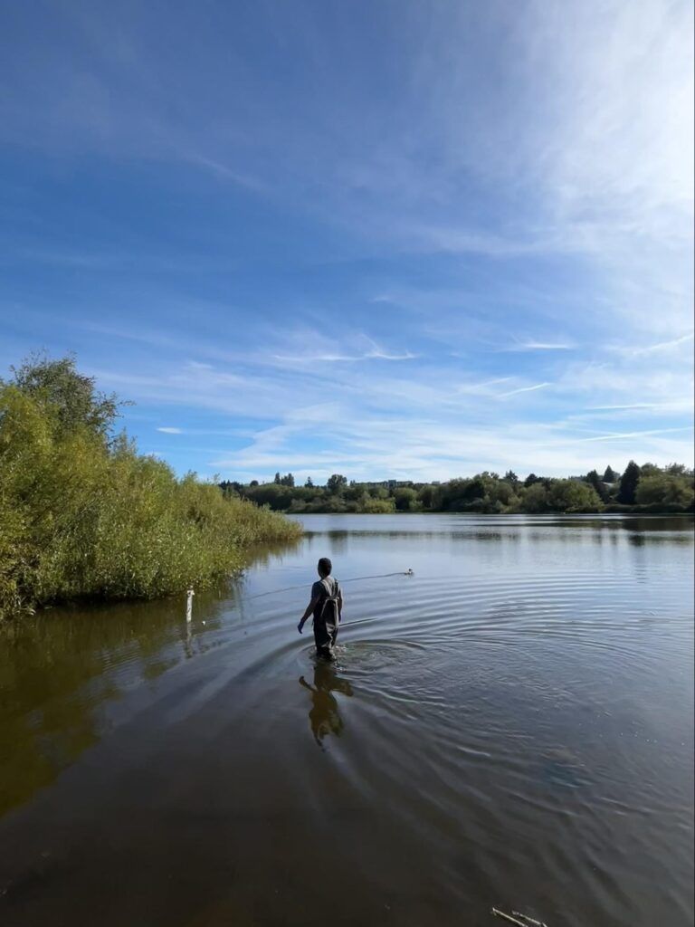 Brandon Weigan venturing into the pond margins of Vancouver’s Trout Lake to retrieve field equipment.