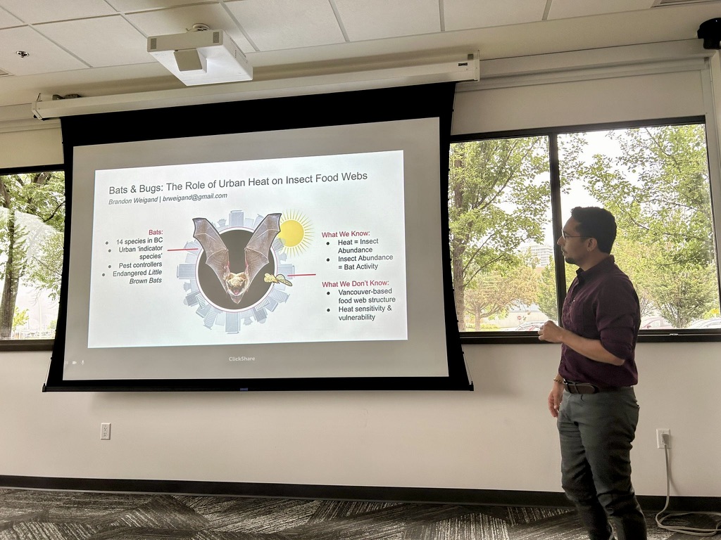 For me, studying urban bat ecology is as much about ensuring their survival as it is about inspiring others to value what we still have. To do this, we need to know how bats navigate the city, what they eat, and how they prioritize decisions under changing conditions. Food webs can vary greatly between cities, and in Vancouver, the connections between insect prey availability and insectivore survival remain largely a mystery. What we do know is that urban life offers both risks and opportunities, shaping when, where, and how these animals can find sustenance. When our green and blue spaces are disrupted or lost, whether by habitat degradation, contamination, or increasing climate extremes, bats and other aerial insectivores may be forced to travel farther, compete harder, and expend energy they can hardly afford, especially during the breeding season. My research explores these pressures in tandem, emphasizing that the fate of urban wildlife depends not only on their capacity to adapt, but also on the integrity of our shared environments.