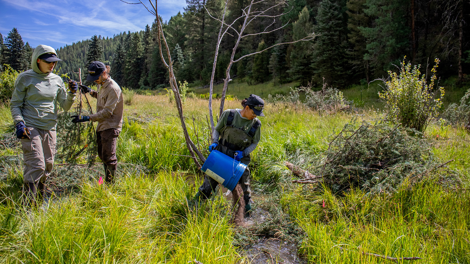 The first step to any successful BDA is choosing the right location. Crews scout out areas that once supported vibrant wetlands but are now dry. Then, using hand tools like axes and small chainsaws, they gather nearby materials to create wooden posts that they drive into the streambed in a line across the channel. These posts form the backbone of the structure, much like the framework of a fence. Next, crews weave branches and other locally sourced brush between the posts, creating a semi-permeable barrier. This mimics the tangled sticks and logs of a natural beaver dam. Finally, they fill in gaps with mud and other nearby sediment, slowing the flow of water while still allowing fish to pass through.