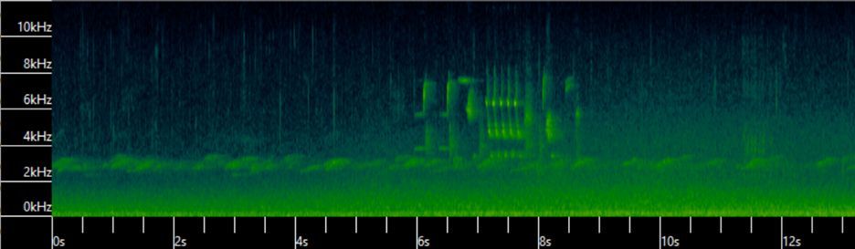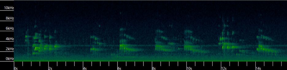 Compare the previous spectrogram to the short, repeated calls which are stacked in horizontal bands coming from a bald eagle. Less complex than the song sparrow’s and clearly spaced call repetitions which matches the eagle’s series of high-pithed chirps/squeals.
