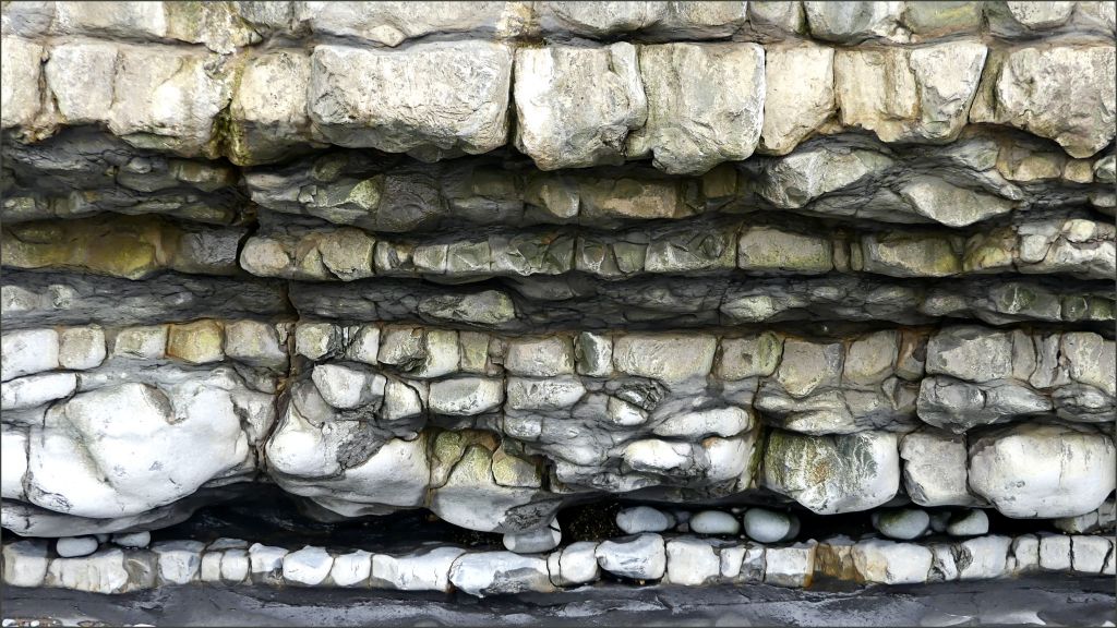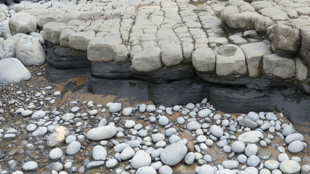 Strata 3 DRB Detail of the rock layers of the Blue Lias Formation exposed in a cliff at Dunraven Bay on the Glamorgan Heritage Coast. There are alternating bands of darker-coloured shale and lighter-coloured limestone from the Jurassic Period. The picture above shows the vertical face of the eroding rocks, while the picture below shows a horizontal rock pavement extending outwards from the base of the cliff. The limestone pavement is one of the lower strata in the sequence for which all the upper strata have fallen away. The neighbouring dark shale is seen immediately below.