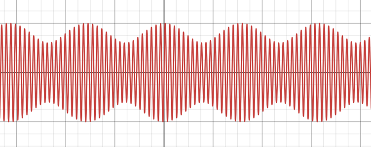 The resulting sound wave exhibits the amplitude modulation called acoustic beats. The envelope of the wave form can be calculated using a standard identity: