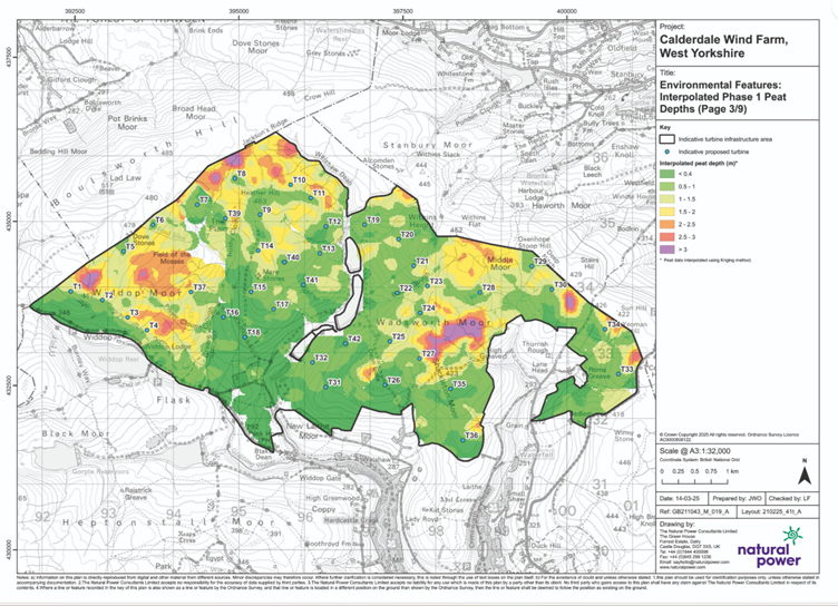 This is the area west of Greave Clough where T38 was going to be until they moved it, and the place where WTRG have been concentrating their fieldwork. There is also a large area here where CWF Ltd don’t know what the peat is like because they didn’t complete the survey in February 2022 and never went back. The previous Scoping Report in 2023 showed the truth about the peat survey in the honest map by Natural Power.