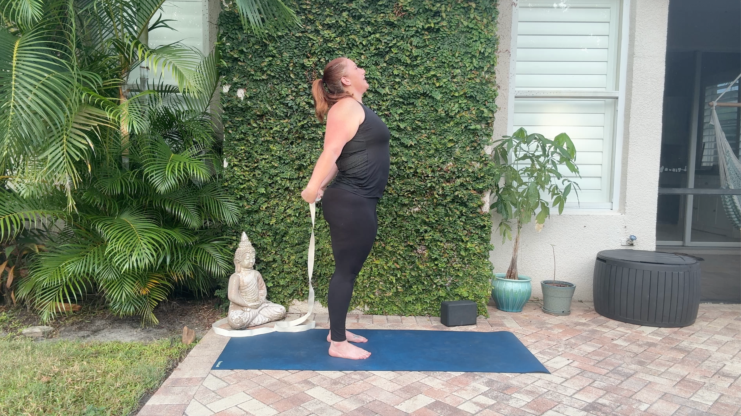 1. From standing, clasp your hands behind your back or hold onto a yoga strap or hand towel.