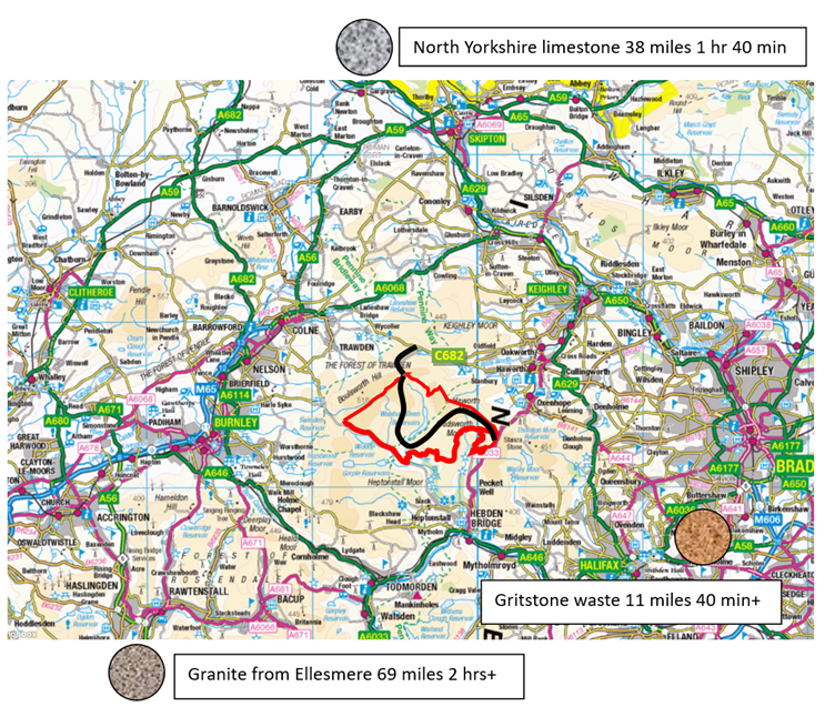 The stone quarries that will supply the chemically suitable gritstone waste are on the Hebble fault that runs from Ogden to Salterhebble. The gritstone will disintegrate to sand under freeze-thaw and should only be used in the deep sub-base below the freezing level, which means deeper granite. The Scoping Report has bulk deliveries of an unspecified nature coming up the M56 and this can only be the “No limestone please; we’re Natural England” granite.