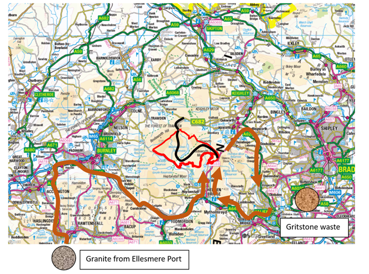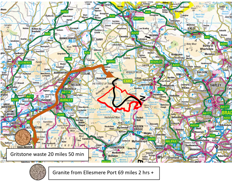 The aggregate sources are clear enough now. The next problem is that trackless Walshaw Moor is in the way as granite and waste converge in a pincer movement on Colne and Hebden Bridge.