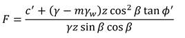 The numerator is the shear strength, the sum of the resisting forces, and the denominator is the shear stress, the sum of the destabilizing forces. The values of c′ (effective cohesiveness) and ϕ′ (angle of friction) can only be measured in situ and will depend on how fibrous the peat is and on the saturation m. If F is less than 1, a spontaneous peat slide is likely. The formula does not include the weight of the track and vehicles, nor the sideways reaction of a cornering vehicle. The model is an infinite slope of constant gradient, so the convexity on Crow Hill is not included either.