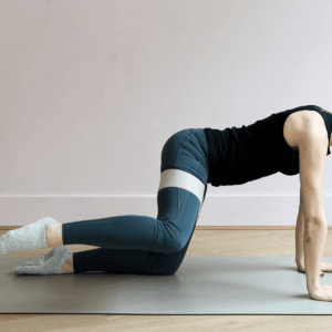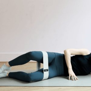 Lie on your side on the floor, bring the legs to 45 degrees in front of you, maintaining a 90 degree angle in the knees. Place one hand on your hip and keep your heels together. With the band on your lower thighs, open up the top knee and lower back down.