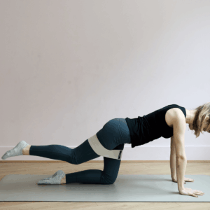 Start in an all fours position, then lift and extend one leg up and outwards, creating an ‘L’ shape. Keep your back as straight as possible as you kick you leg up. Slowly lower and repeat for desired number of reps. Make sure to keep abs tight and back straight.