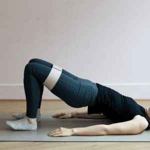 Lay down with your back on the floor, then draw your feet in towards your hips, with your feet flat on the floor and raise your hips. Rest your arms on the floor at your sides.