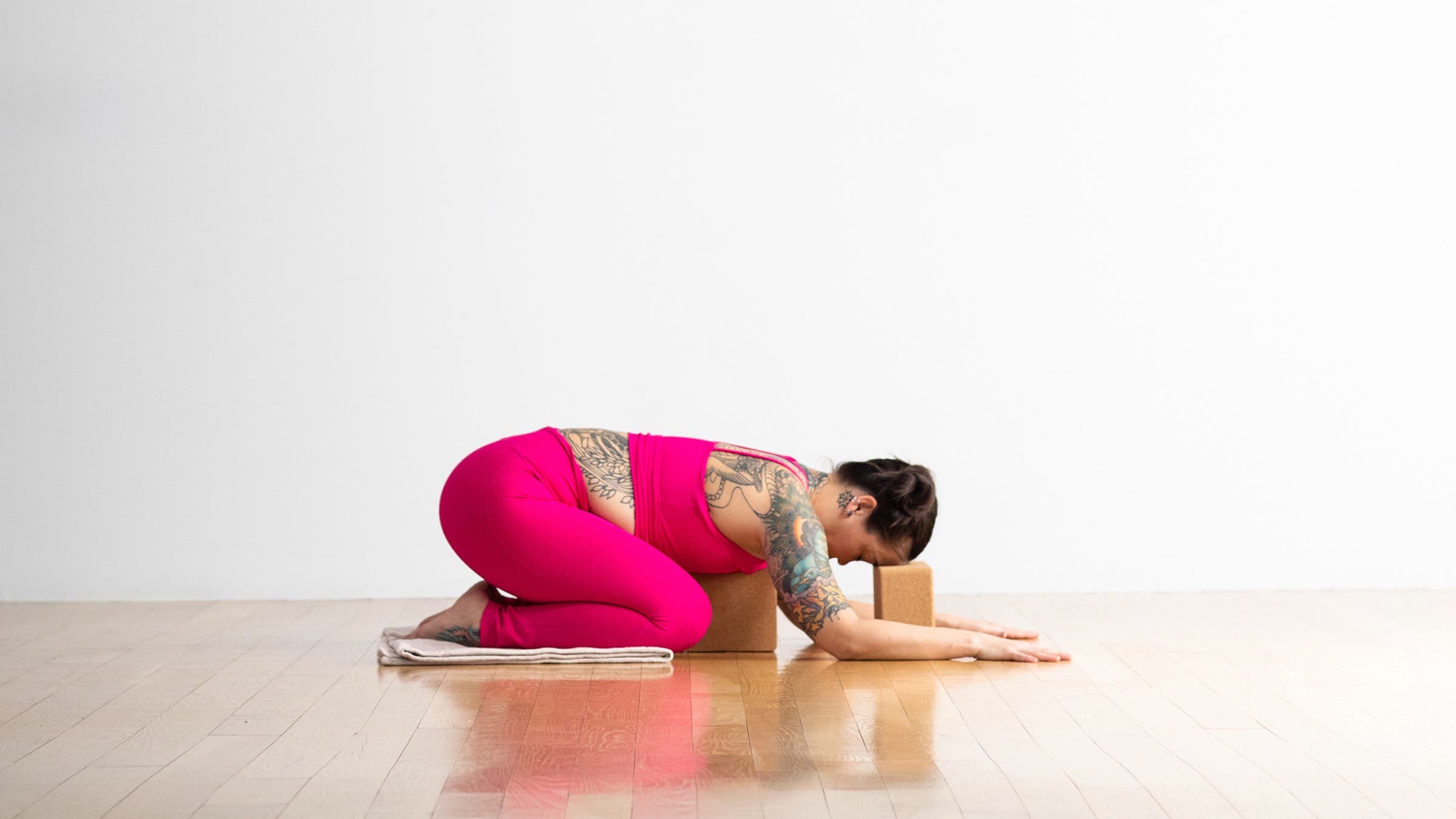 These are poses you can return to any time your lower back feels tight. Grab a bolster or blanket and a block or a stack of books to help make some of the stretches more doable. Practice slow, deep breathing to calm tension in your body and guide your lower back into release.