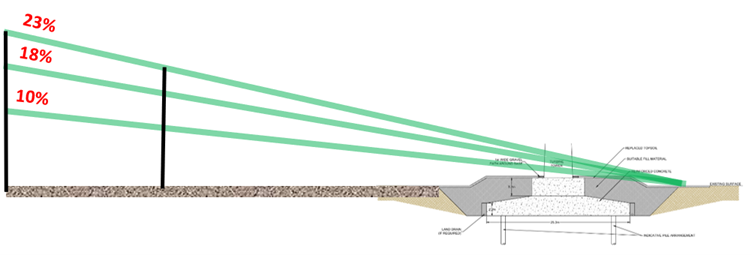 The amount of earth removed to create the flat platform for the foundation and hardstanding is proportional to the slope percentage. If the access track and hardstanding are parallel to the contours, the platform is narrower and longer. As the width of the rectangular platform is about 70% of the length, this narrower platform would require 70% of the soil removal. If the platform is modelled as a rectangle x by y with x > y and the slope gradient is g, the removed soil is gxy2 parallel to the contours or gx2y perpendicular to the contours.