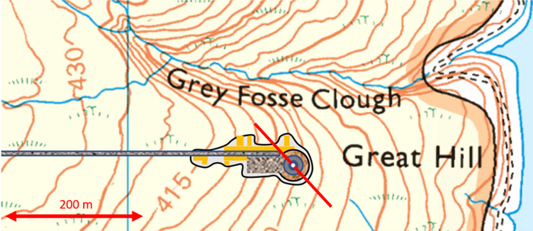 The map below shows the excavation for T13 to scale. The depth is 18 metres at the west end of the hardstanding and 28 metres deep (a 10-storey house) as the track enters the platform. The destruction of the SAC for T12 north of Grey Fosse Clough will be even more extreme, as would be the effect on storm flow, but we shall keep that one for another day. Look at those converging contours! T13 could be rotated parallel to the contours, but that involves a traversing track across deep peat, which I must not encourage.
