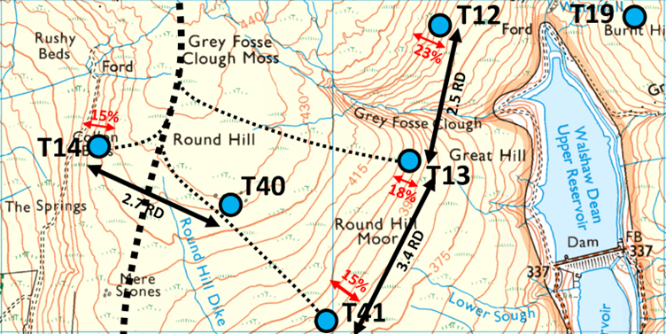 The maximum gradient of any turbine site on Pen y Cymoedd is the 8.5% shown in the map above, and these two turbines are outliers on the steepest section. The crucial difference in terrain from Walshaw Moor is that the flatter ground was available in Wales. This made the dig much less destructive and simpler, and reduced flood risk. The typical slope under the Pen y Cymoedd turbines is 0-4%.