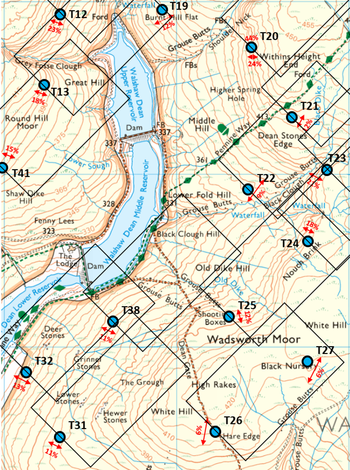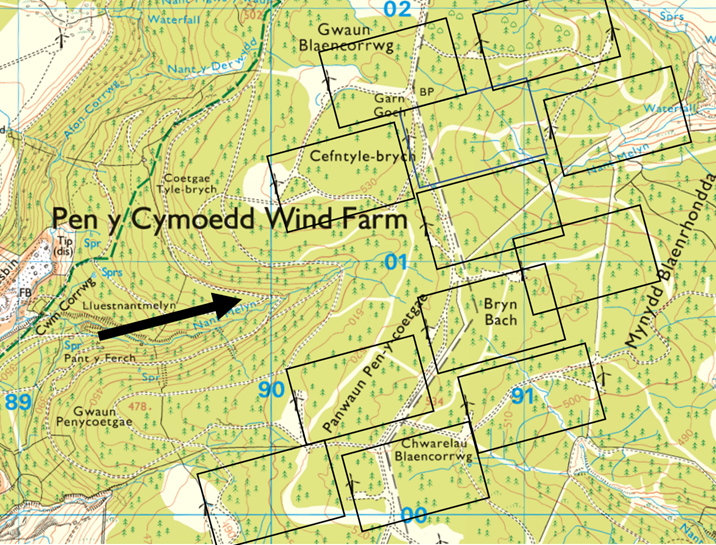 Pen y Cymoedd (228 MW) was developed by Vattenfall on land owned by the former Welsh Forestry Commission, with 76 Siemens 108/113 3 MW turbines. The map above shows the 3 RD by 5 RD spacing rectangles in the direction of the prevailing wind from bearing 255°; the footprints have hardly any overlap; wind turbines don’t need much earth, but they need a lot of air. The terrain here is like Walshaw Moor, with flat ridges above tight valley heads, but 100 metres higher. The Welsh ground is much steeper than the Pennines in places, and the contour interval on the Welsh map is 10 metres rather than the 5 metres of the CEP maps in this blog. The site choice was excellent. The track network uses some of the existing forestry roads that were already suitable for HGVs; the peat had already been lost to the conifers; the aggregates were all sourced on site; the National Grid 400 kV substation is only 6 km north at Rhigos; and the site was neither SPA, nor SAC, nor pledged to our Kunming-Montreal 30 by 30 obligations on biodiversity, nor alive with curlews (almost extinct in Wales) nor the inspiration for three of the most famous women in the history of the world.