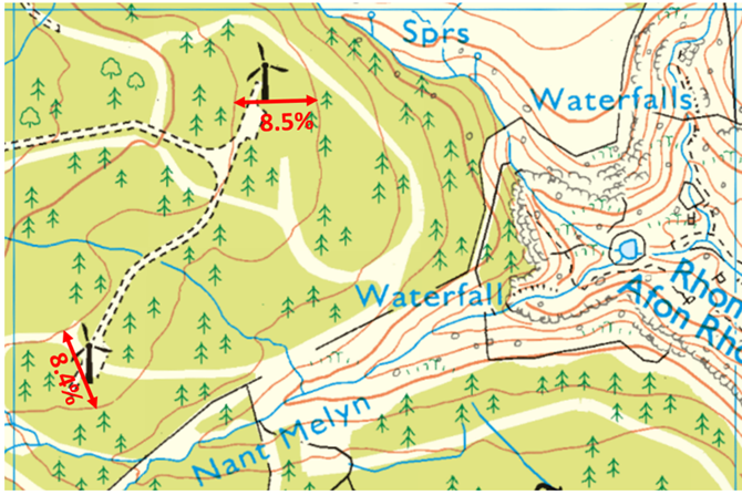 A wind turbine is not built on a slope of more than 10% gradient unless there are very pressing reasons, and you don’t choose 10% if you can resite to 4% with 60% less spoil. Building on the steeper ground also inevitably increases the speed of storm-water run-off.