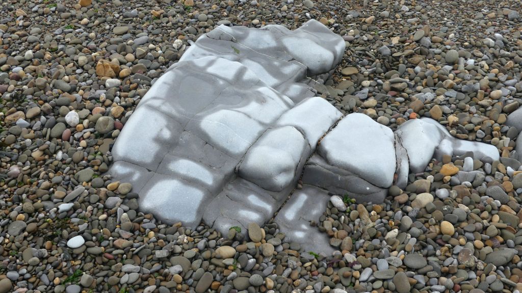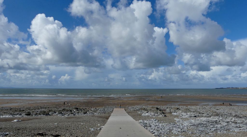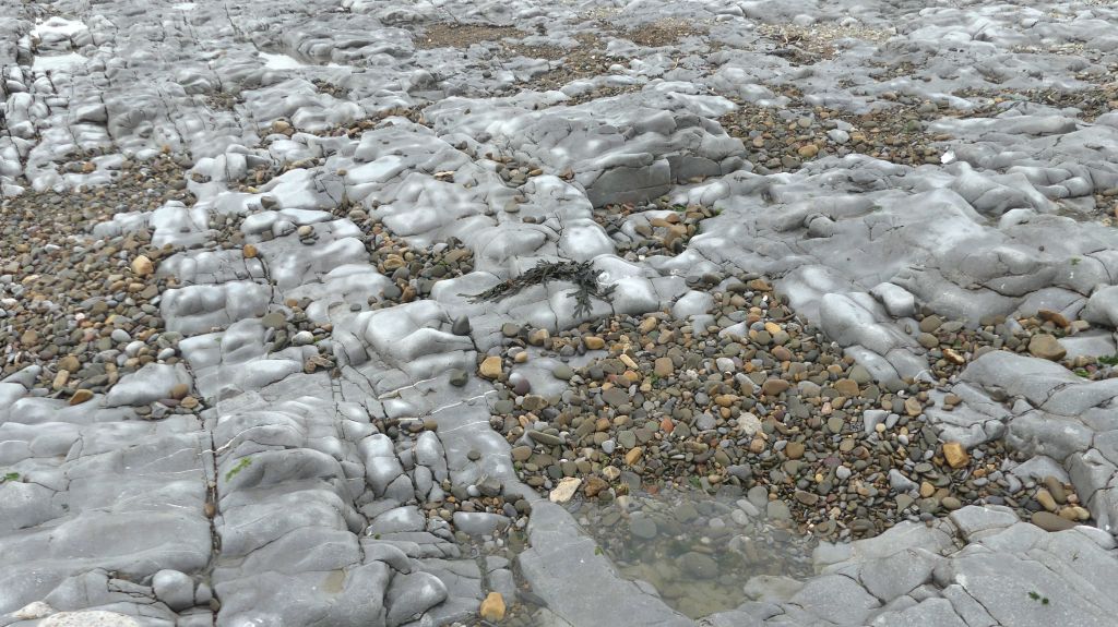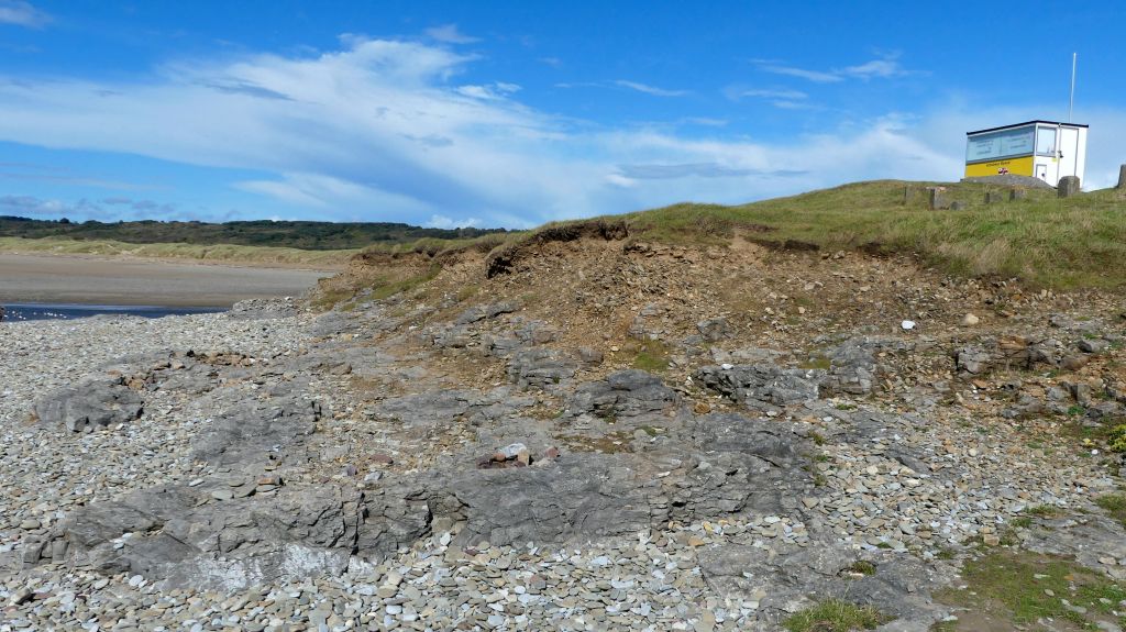 The oldest rocks at Ogmore-by-Sea on the Glamorgan Heritage Coast are Pembroke Limestone from the Carboniferous era and dating from over 300 million years ago. The slipway to the beach by the Life Guard Station crosses near-horizontal beds of this Pembroke Limestone Group that have been worn away by the action of the sea into a low wave-cut platform at the base of the cliff. The photos show aspects of this outcrop, and you can find more information online provided by the Geologist’s Association, South Wales Group in their leaflet “Geological Walks in Wales – Ogmore-by-Sea, Vale of Glamorgan“.